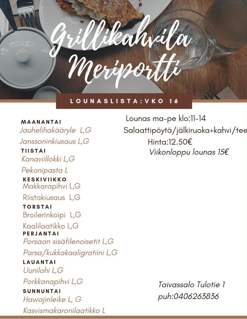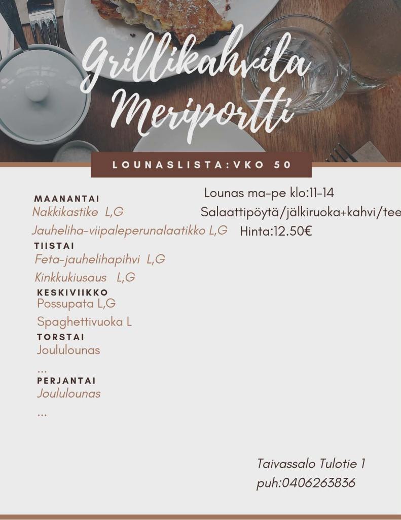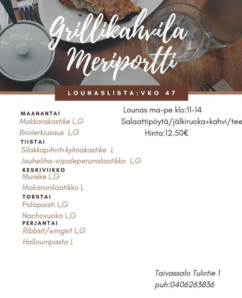 Grillikahvila Meriportti on kustavintien varrella sijaitseva maistuvia lounas-, grilli- ja kahvilatuotteita tarjoava yritys. Valikoimiin kuuluu todella maukkaat hampurilaiset ja suuret ranskalaisannokset. Alusta asti itse tehty lounas seisovasta pöydästä, monipuolisten salaattien kera. Itse tehdyt munkit ja pullat, täytetyt sämpylät. Kaikkea voit nauttia paikanpäällä tai ottaa kotiin mukaan :)