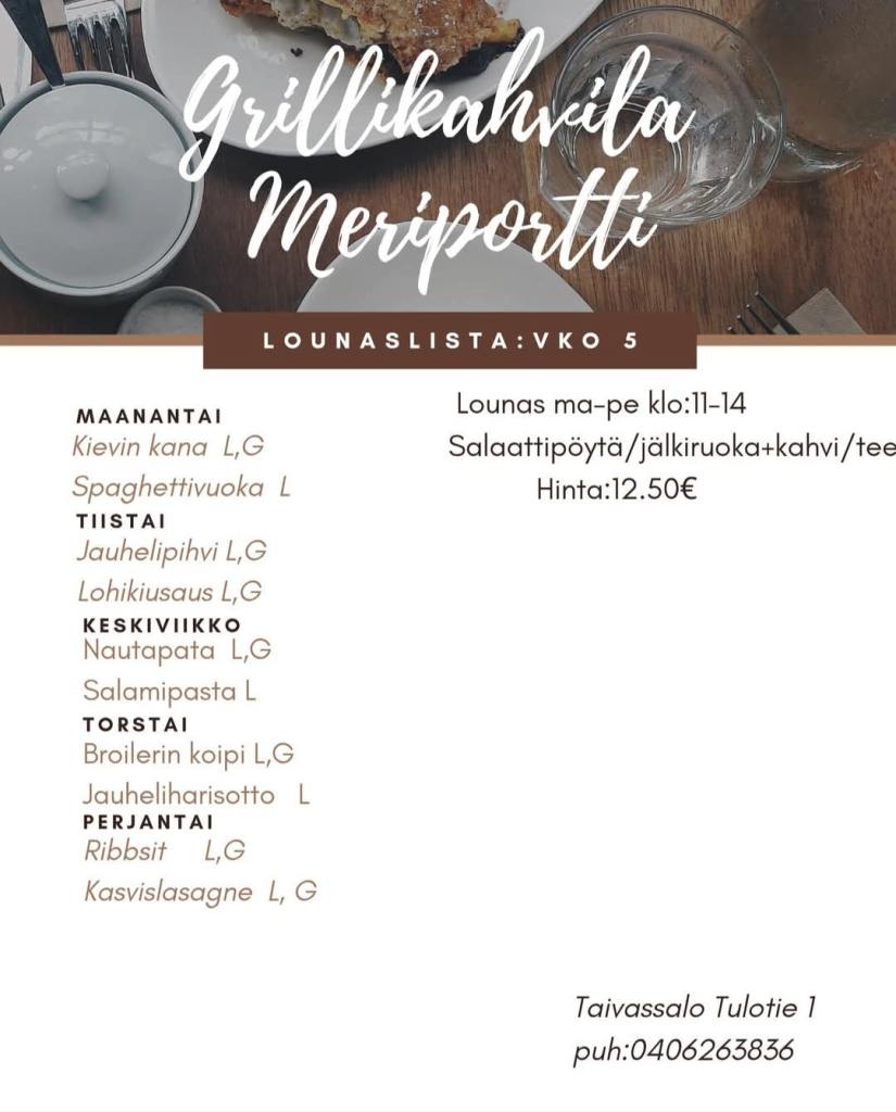Grillikahvila Meriportti on kustavintien varrella sijaitseva maistuvia lounas-, grilli- ja kahvilatuotteita tarjoava yritys. Valikoimiin kuuluu todella maukkaat hampurilaiset ja suuret ranskalaisannokset. Alusta asti itse tehty lounas seisovasta pöydästä, monipuolisten salaattien kera. Itse tehdyt munkit ja pullat, täytetyt sämpylät. Kaikkea voit nauttia paikanpäällä tai ottaa kotiin mukaan :)
