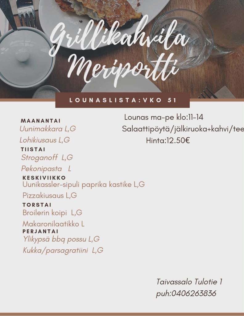 Grillikahvila Meriportti on kustavintien varrella sijaitseva maistuvia lounas-, grilli- ja kahvilatuotteita tarjoava yritys. Valikoimiin kuuluu todella maukkaat hampurilaiset ja suuret ranskalaisannokset. Alusta asti itse tehty lounas seisovasta pöydästä, monipuolisten salaattien kera. Itse tehdyt munkit ja pullat, täytetyt sämpylät. Kaikkea voit nauttia paikanpäällä tai ottaa kotiin mukaan :)