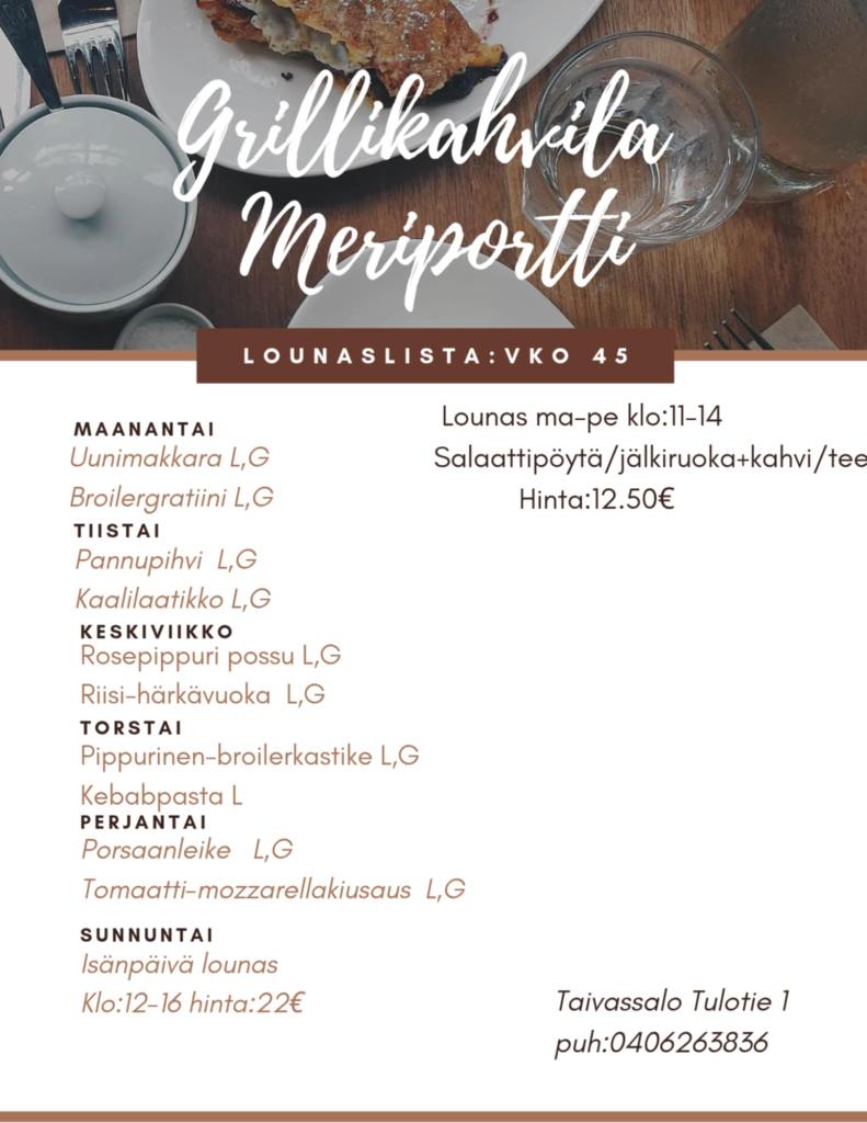 Grillikahvila Meriportti on kustavintien varrella sijaitseva maistuvia lounas-, grilli- ja kahvilatuotteita tarjoava yritys. Valikoimiin kuuluu todella maukkaat hampurilaiset ja suuret ranskalaisannokset. Alusta asti itse tehty lounas seisovasta pöydästä, monipuolisten salaattien kera. Itse tehdyt munkit ja pullat, täytetyt sämpylät. Kaikkea voit nauttia paikanpäällä tai ottaa kotiin mukaan :)